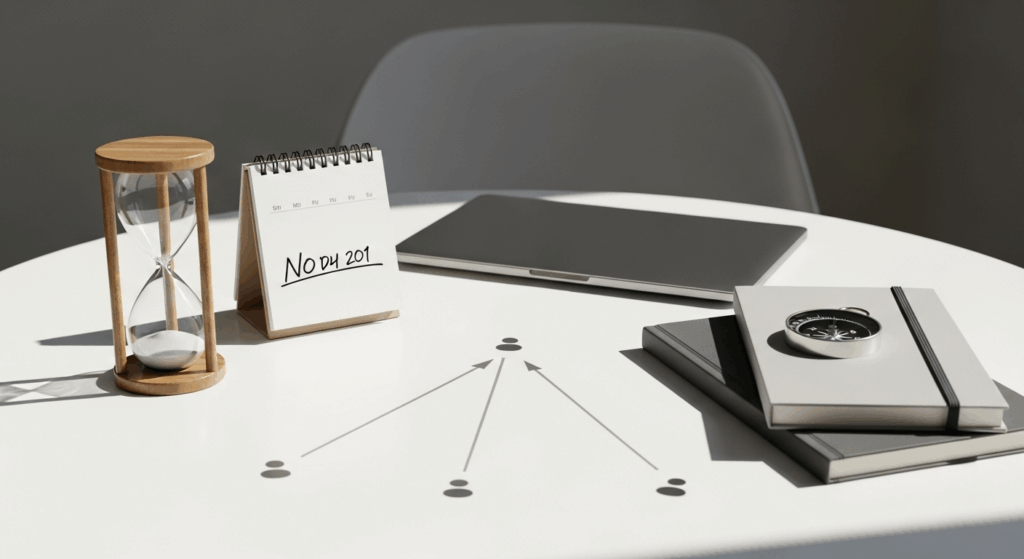 机にメモを一枚。最初の3分で、10年/1年/1か月/1週間それぞれでの自分の行動を一行ずつ書き出す。次の1分で、上の三行プロンプトを使って最短プロセスをAIに吐き出させる。最後の1分で、返ってきた案から今日の15分タスクをひとつだけ選び、カレンダーに落とす。